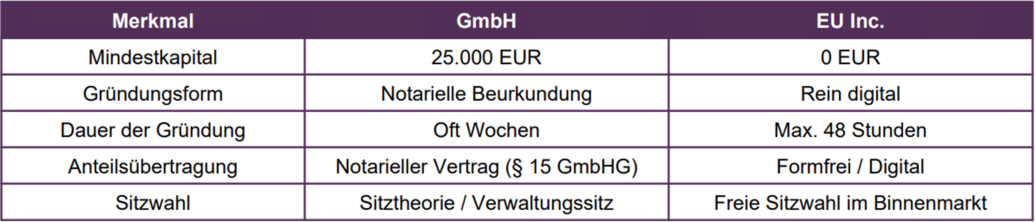 Der Verordnungsvorschlag schafft eine neue Rechtsform, die neben der deutschen GmbH steht. Die EU Inc. bricht mit einigen festen Konzepten des deutschen Kapitalgesellschaftsrechts und sieht radikale Vereinfachungen vor, die auf Schnelligkeit und Digitalisierung setzen: